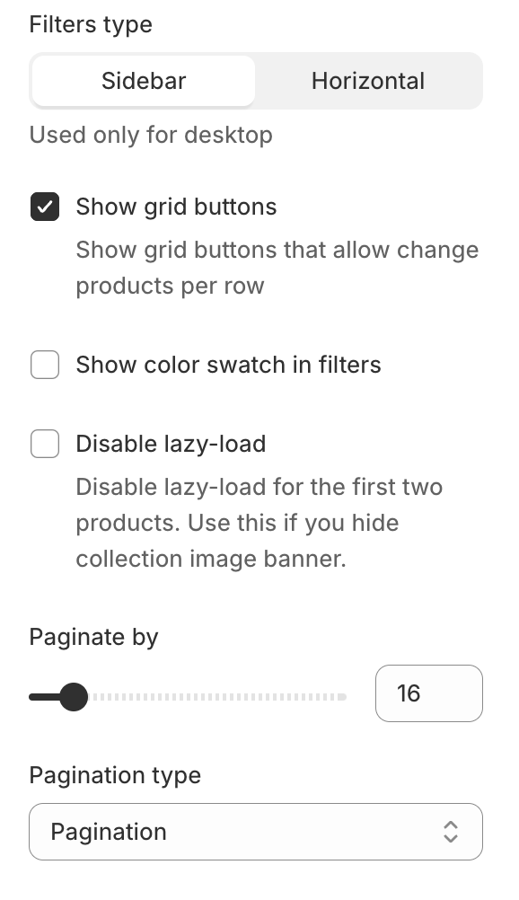 5. **`Disble lazy-load`**- the setting is responsible for disabling lazy-load for the first two products. Use this if you hide the collection image banner;