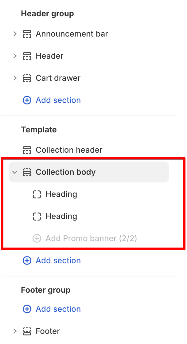 The section is static on the **collection page** template, it was added initially and cannot be removed.