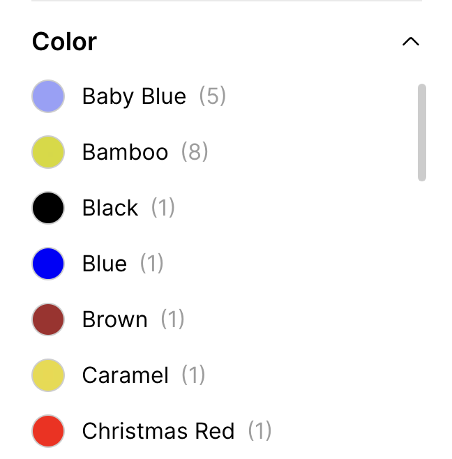 3. **`Show color swatch in filters`** - if checked, the filter group with name, specified in the Theme settings / Product / Swatch option ("Color" by default) will show a checkbox like color swatch;