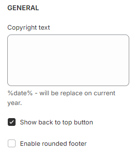 1. **`Copyright text`** - the setting allows you to set the **copyright** text, where `%date%` is a **shortcut** that will be replaced with the current year;