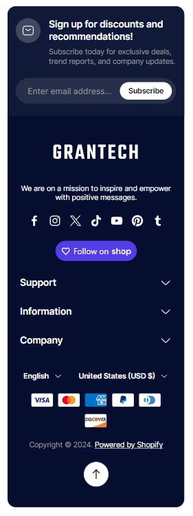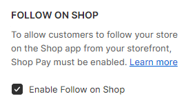1. **`Enable Follow on Shop`** - enable “Follow on Shop” which allows customers to follow your store on the Shop app. Learn more in the [Shopify documentation](https://help.shopify.com/en/manual/online-store/themes/customizing-themes/follow-on-shop).