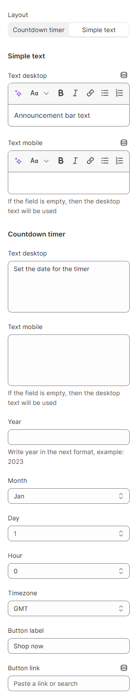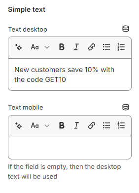 2. **`Text mobile`** - the setting allows you to set the text content for **Mobile**. If the content is empty, the content will be taken from the **Desktop** version.
