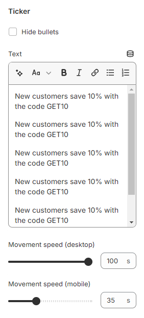 3. **`Movement speed (desktop)`** - the setting allows you to set the ticker animation speed on the **desktop**;