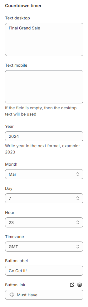 * **`Countdown timer`** - a countdown timer will be displayed, the settings for it are below in the **Countdown timer** block;