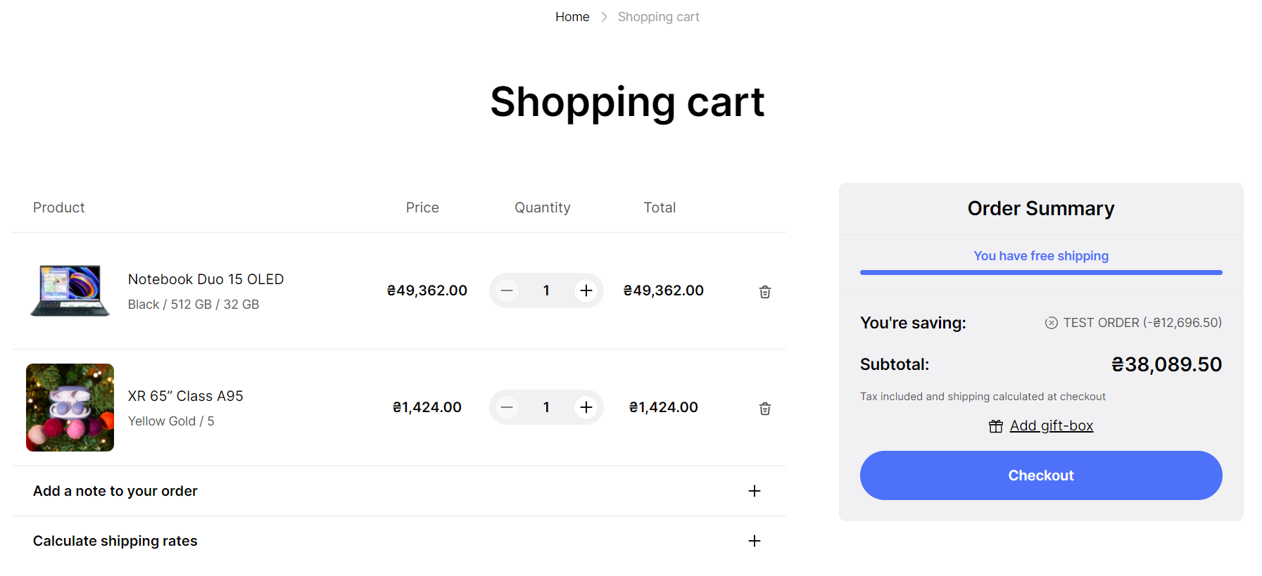 <figure><img src="https://content.gitbook.com/content/wp6wpeVynqvtz0WMVrUT/blobs/43J3AjT60mXPOuK2T6Mm/Dev-Gain-theme%20%C2%B7%20Customize%20NT%20-%20Cart%20%C2%B7%20Shopify%202023-11-09%2015-56-30.png" alt=""><figcaption><p>7.<strong><code>Show shipping rates calculator</code></strong></p></figcaption></figure>