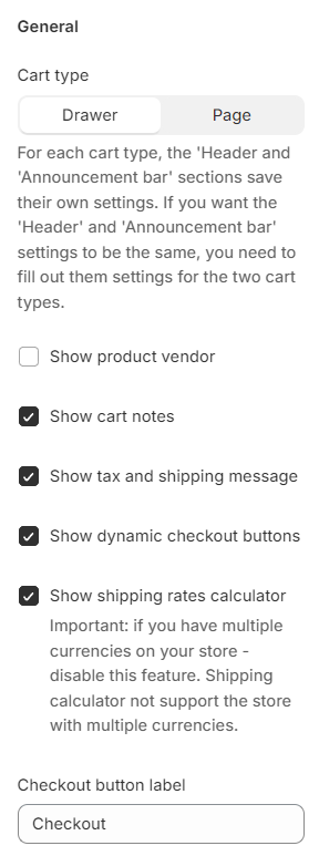 1. **`Cart type`** - the setting is responsible for the type of cart. It has two values: *drawer, page*;