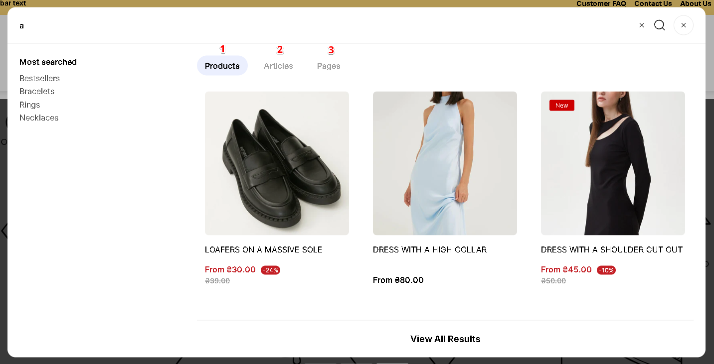 1. If the `Enable search by articles` or `Enable search by pages` setting is enabled, then **tabs** appear in the search **sidebar**. If no results are found in any of the categories, then this tab will be **disabled**.