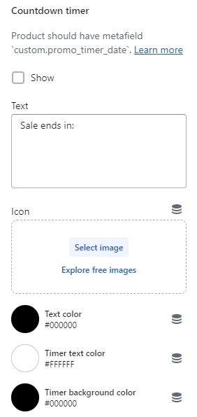 Show- if checked - the countdown timer will be shown;Text- Text before countdown timer;Icon- Image before countdown timer. (Recommended size 48x48);**
