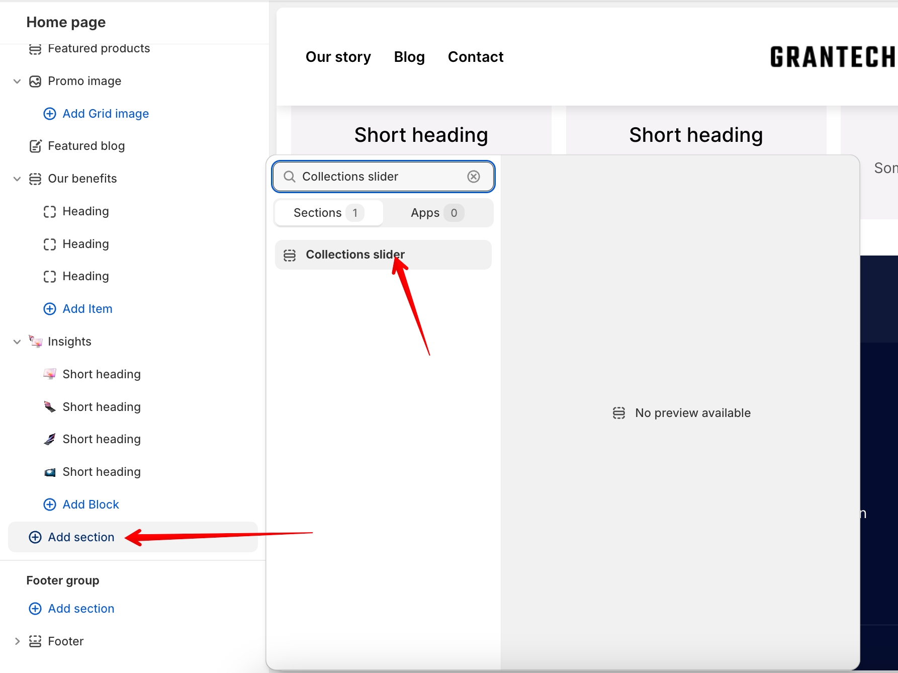 In this section, you can add blocks with collections.