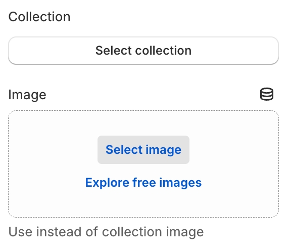 - image picker. Use instead of collection image. If the setting is empty and the collection image is empty then an image from the first product of the collection will be shown.