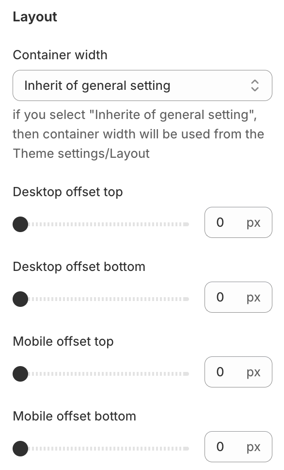 - a container width of the section. If “Inherit” value is selected then container width based on the group 'Layout' settings in the Theme settings;Desktop offset top