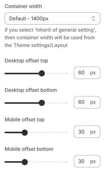 - a container width of the section. If the “Inherit” value is selected then the container width is based on the group 'Layout' settings in the Theme settings;Desktop offset top