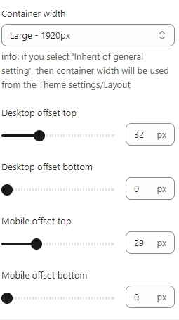 - a container width of the section. If the “Inherit” value is selected then the container width is based on the group 'Layout' settings in the Theme settings;Desktop offset top