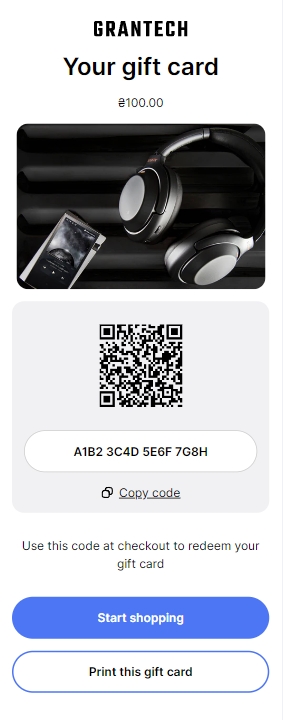 Logo- the setting allows you to specify a logo, otherwise the name of the store will be displayed;Logo width- setting allows you to specify the size of the logo;Gift card image- an image that will replace the default gift card image;Start shopping button type- sets the style of the “Start shipping” button;Print button type- sets the style of the “Print” button.