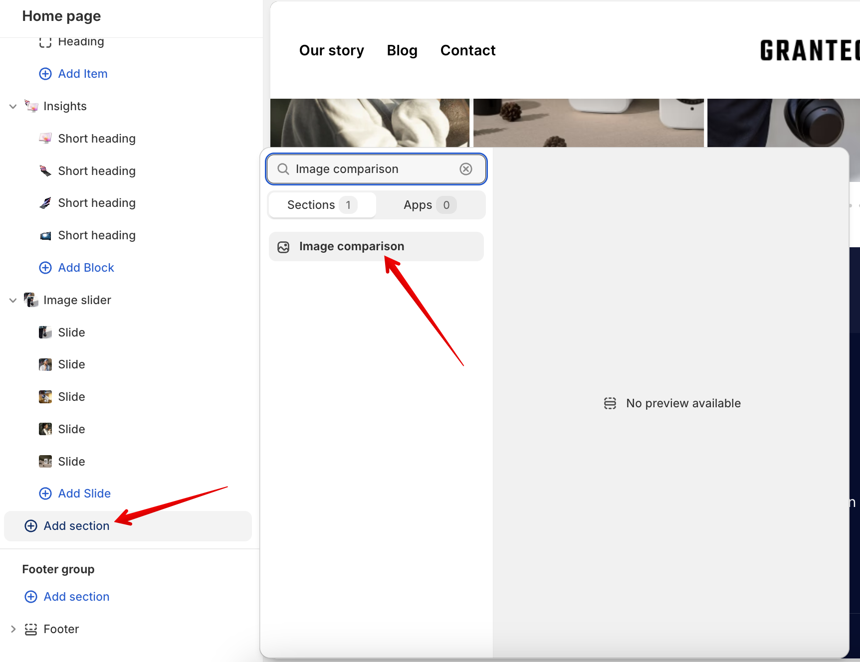 In order to add a section, you need to go to **`Customizer`** → **`Add Section`** → **`Image comparison`**.