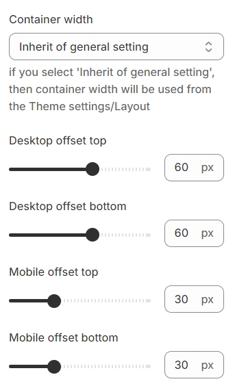 - a container width of the section. If “Inherit” value is selected then container width based on the group 'Layout' settings in the Theme settings;Desktop offset top