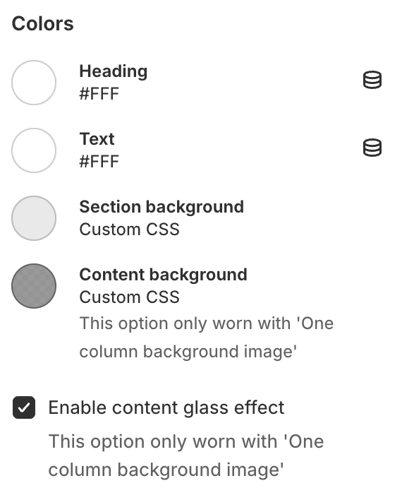 - content background color. Works only when layout type One column background image is selected;Enable content glass effect