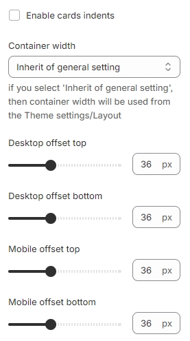 - enable the card indent between benefits blocks. You can use this when enabling card background;Container width