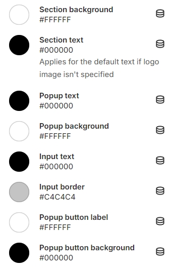 Section background- the setting allows you to set the background color of the section;Section text- the setting allows you to set the color of the default text if logo image isn't specified;Popup text- the setting allows you to set the color of the popup text;Popup background- the setting allows you to set the popup background;Input text- the setting allows you to set the input text color;Input border- the setting allows you to set the border color of the popup form input;Popup button label- the setting allows you to set the text color of the popup form button;Popup button background- the setting allows you to set the background color of the popup form button.