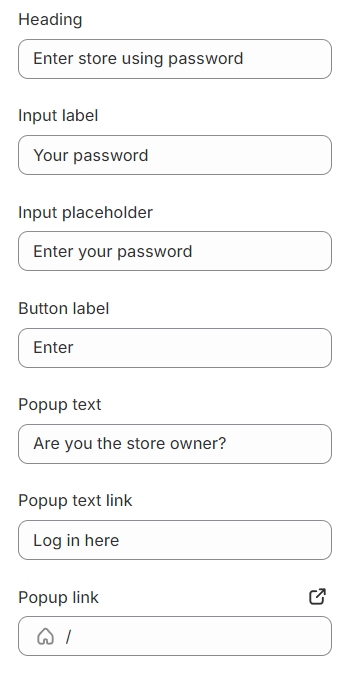Heading- the setting allows you to set the title text of the popup;Input label- the setting allows you to set the label of the popup input (If not set, it is taken from translations);Input placeholder- the setting allows you to set the placeholder text of the popup input (if not set, it is taken from translations);Button label- the setting allows you to set the label of the popup button (If not set, it is taken from translations);Popup text- the setting allows you to set the text of the section (If not set, it is taken from translations).Popup text link- you can set the text for the string.Popup link- it is possible to set the force forText link.