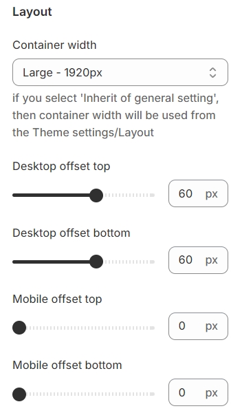- a container width of the section. If the “Inherit” value is selected then the container width is based on the group 'Layout' settings in the Theme settings;Desktop offset top