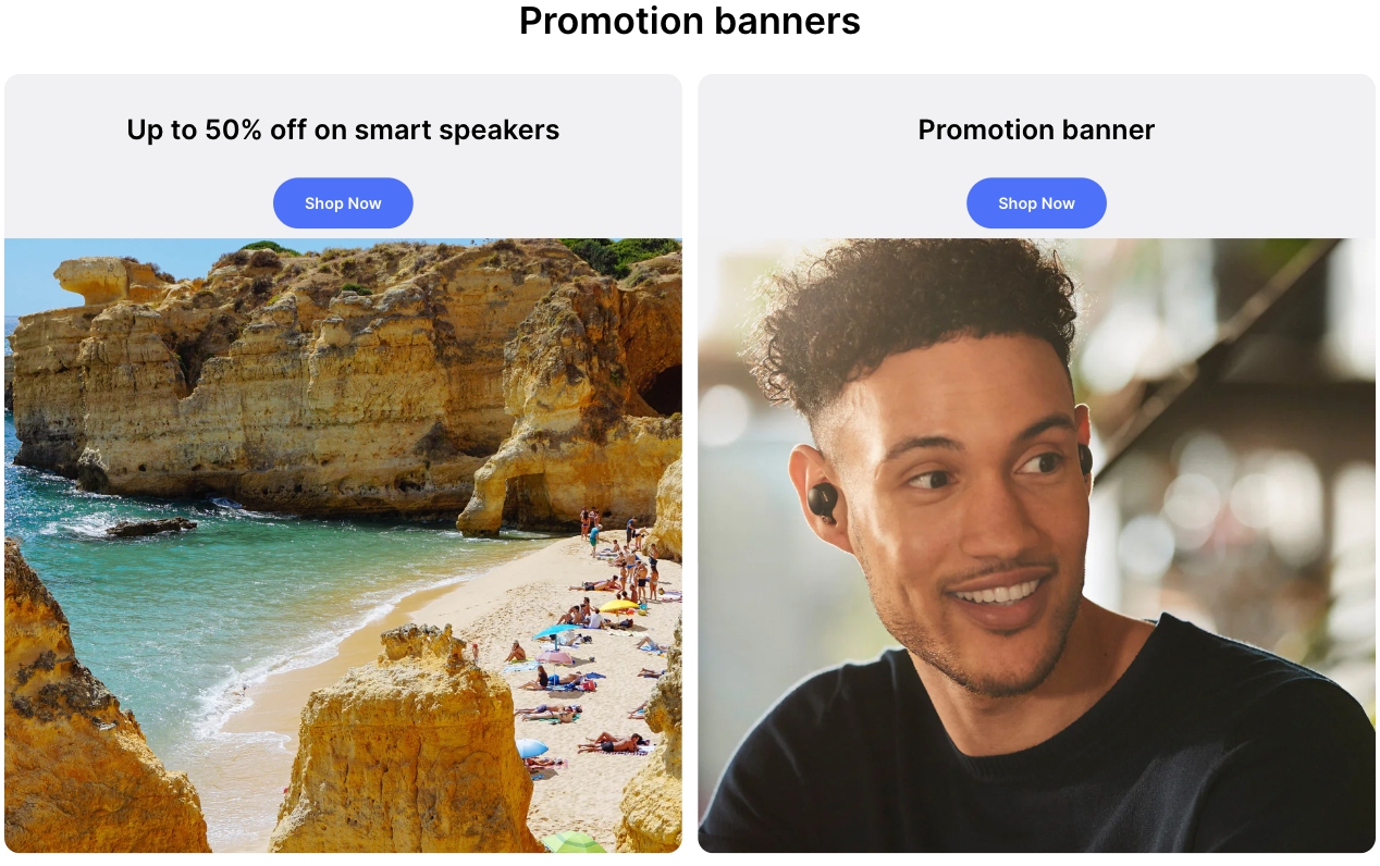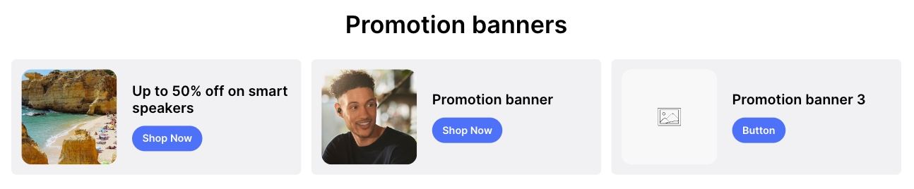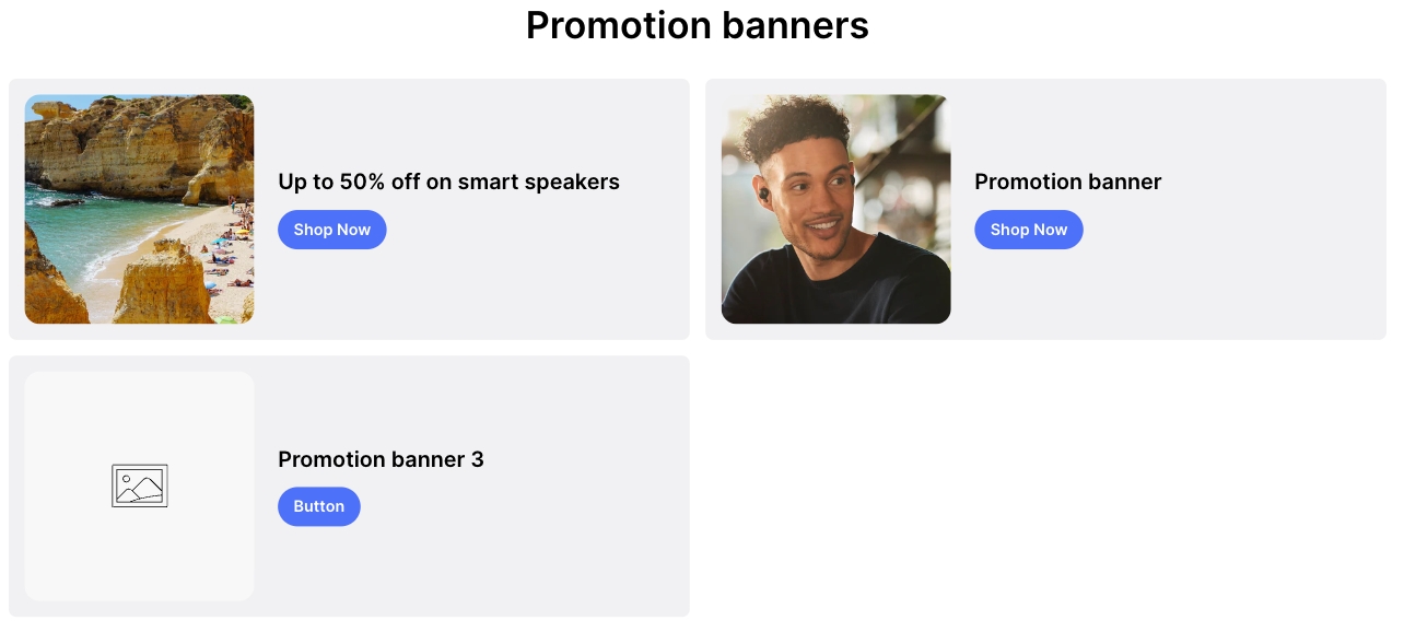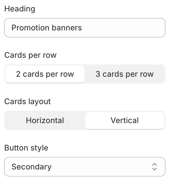 Heading- setting allows you to set the text for the title.Cards per row- the setting allows you to choose the type of section display in 2 or 3 blocks;Cards layout- the setting allows you to choose the type of blocks: horizontal / vertical;Button style- you can set a style for the button: primary / secondary / primary with border / secondary with border;