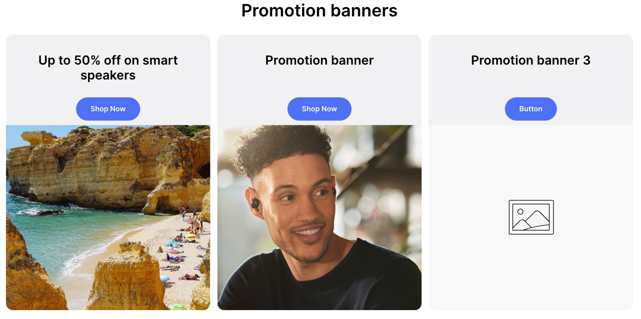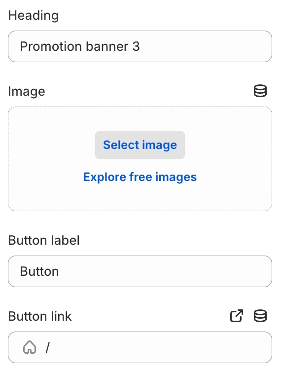Heading- setting allows you to set the heading in the block;Image- setting allows you to set the image of the block;Button label- setting allows you to set the text for the button in the block;Button link- setting allows you to set the URL for the button in the block.