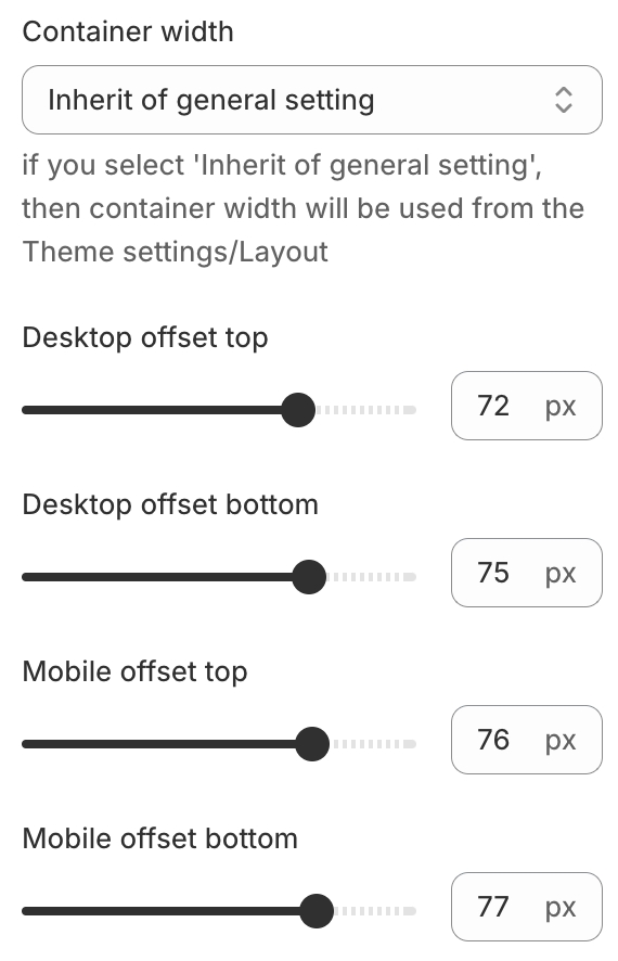 Container width- a container width of the section. If the “Inherit” value is selected then the container width is based on the group 'Layout' settings in the Theme settings;Desktop offset top- the top indent of the section on the desktop;Desktop offset bottom- the bottom indent of the section on the desktop;Mobile offset top- the top indent of the section on the mobile;Mobile offset bottom- the bottom indent of the section on the mobile.