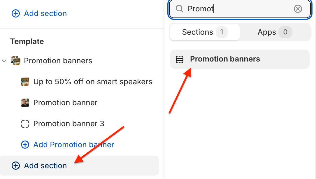 In order to add a section, you need to go to Customizer → Add Section → Promotion banners.