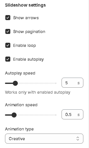 Show arrows- the setting is responsible for displaying the arrows for switching between slides;Show pagination- the setting is responsible for displaying pagination;Enable loop- the setting is responsible for setting the infinite scrolling of the slider;Enable autoplay- the setting is responsible for setting the automatic switching of slides;Autoplay speed- the setting is responsible for the speed of automatic switching of slides;Animation speed- the setting allows you to set the animation speed of switching slides;Animation type- the setting allows you to set the type of animation for switching slides:Fade