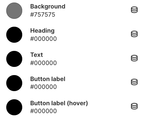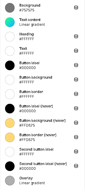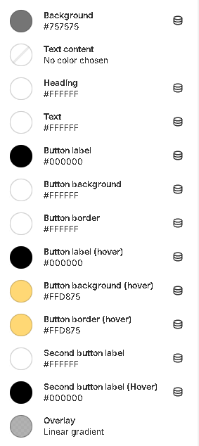 Background- the setting allows you to set the background color of the slide;Heading- the setting allows you to set the color for the header;Text- the setting allows you to set the color for the description;Button label- the setting allows you to set the color for the button label;Button label- the setting allows you to set the color for the button label when the user hovers over it.