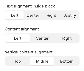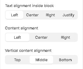 Text alignment inside block- the setting allows you to set the alignment for the text;Content alignment- the setting allows you to set the alignment for the content;Vertical content alignment- the setting allows you to set the vertical alignment for the content.