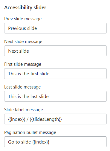 Heading- the setting allows you to set the heading;Text- the setting allows you to set the text;Button label- the setting allows you to set the label for the button;Button aria-label- the setting allows you to set the text for the aria-label attribute. The attribute is needed for accessibility;Button link- the setting allows you to set a link for the button;Open link in a new tab- the setting allows you to indicate how the second link will open, in the current tab or the new;Make link clickable on the entire slide- the setting allows you to make the entire slide a link.