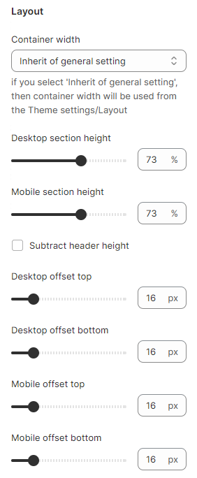 Container width- a container width of the section. If the “Inherit” value is selected then the container width is based on the group 'Layout' settings in the Theme settings;Desktop section height- the setting is responsible for the height of the section for the desktop;Mobile section height- the setting is responsible for the height of the section for mobile;Subtract header height- the setting is responsible for subtracting the header height from the slideshow size. This will be useful when you set the slideshow size to 100% and turn on the setting, then you will fit the announcement bar, header, and slideshow on one screen;Desktop offset top- top indent of the section on the desktop;Desktop offset bottom- bottom indent of the section on the desktop;Mobile offset top- top indent of the section on the mobile;Mobile offset bottom- bottom indent of the section on the mobile.