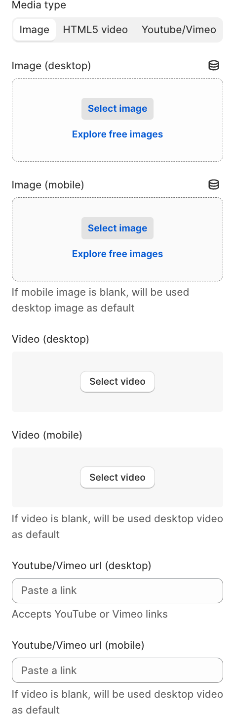 Media type- the setting allows you to select a media content type you want to show (Image, HTML 5 video, YouTube/Vimeo);Image desktop- choose the desktop image;Image mobile- choose the mobile image. If not set - the desktop image will be used;Video (desktop)- choose the HTML5 desktop video;Video (mobile)- choose the HTML5 mobile video. If not set - the desktop video will be used;YouTube/Vimeo url (desktop)- add the YouTube/Vimeo desktop video URL;YouTube/Vimeo url (mobile)- add the YouTube/Vimeo mobile video URL. If not set - the desktop video will be used;