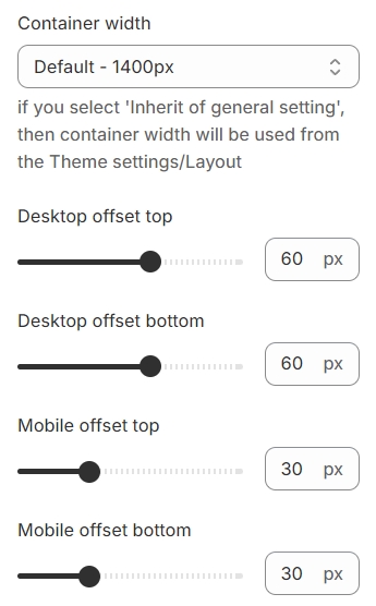 - a container width of the section. If “Inherit” value is selected then container width based on the group 'Layout' settings in the Theme settings;Desktop offset top