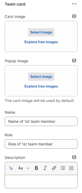 Cart image- the setting allows you to set an image for the card;Popup image- the setting allows you to set an image for the popup;Name- the setting allows you to specify text for the name field;Role- the setting allows you to specify text for the role field.
