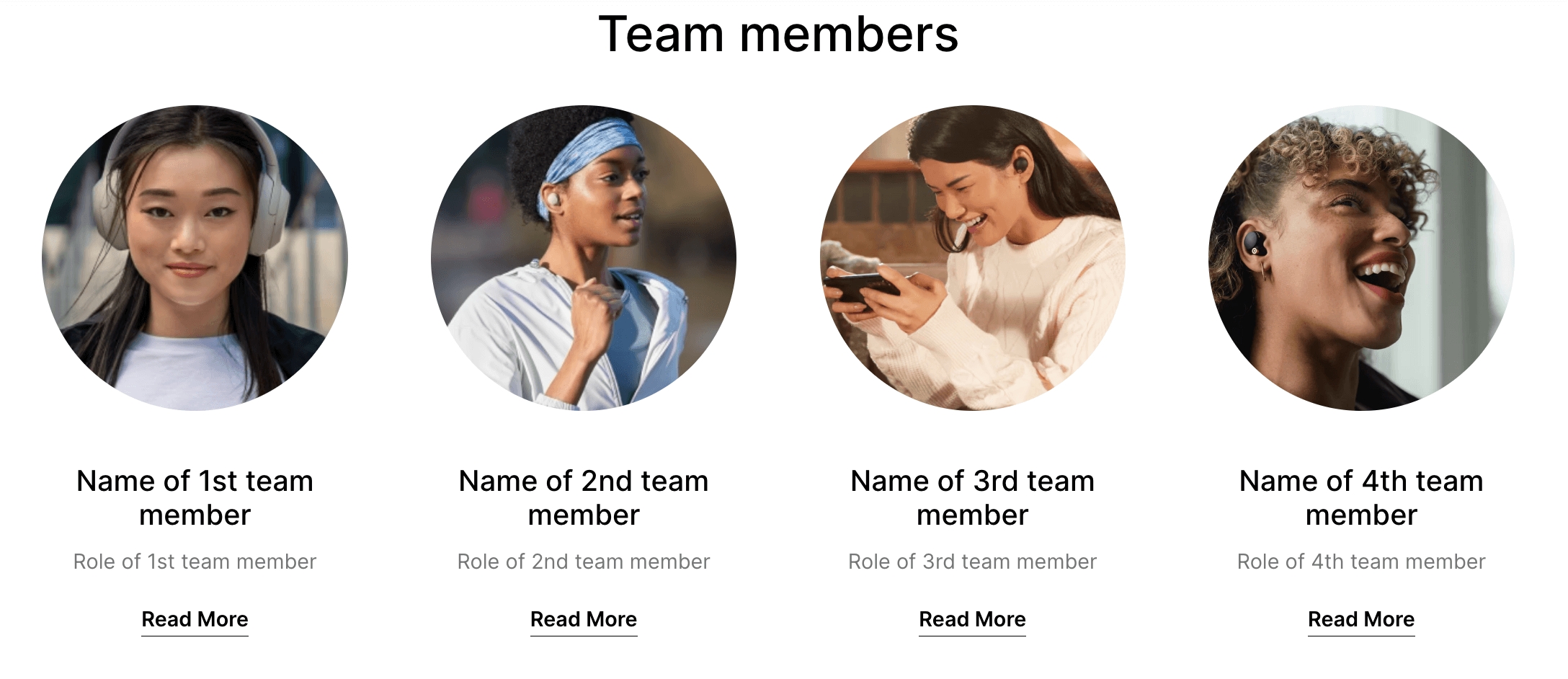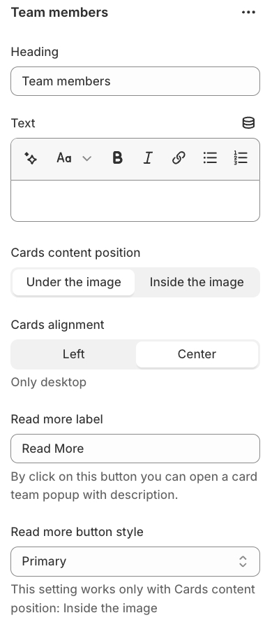 Heading- the setting allows you to set the text for the title;Text- the setting allows you to set the section description;Cards content position- the setting allows you to select the position of the text within the image;Cards alignment- the setting allows you to select the type of card alignment;Read more label- the setting allows you to set a text for a button that opens a popup;Read more button style- the setting allows you to set a style for a button that opens a popup.