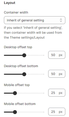 Container width- a container width of the section. If the “Inherit” value is selected then the container width is based on the group 'Layout' settings in the Theme settings;Desktop offset top- the top indent of the section on the desktop;Desktop offset bottom- the bottom indent of the section on the desktop;Mobile offset top- the top indent of the section on the mobile;Mobile offset bottom- the bottom indent of the section on the mobile.
