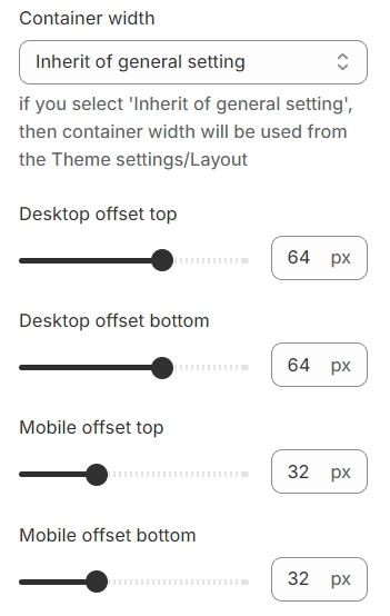 - a container width of the section. If “Inherit” value is selected then container width based on the group 'Layout' settings in the Theme settings;Desktop offset top