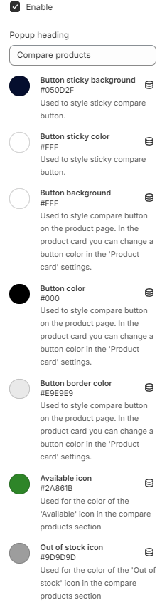 4. **`Button sticky color`** - text color of sticky compare product button;