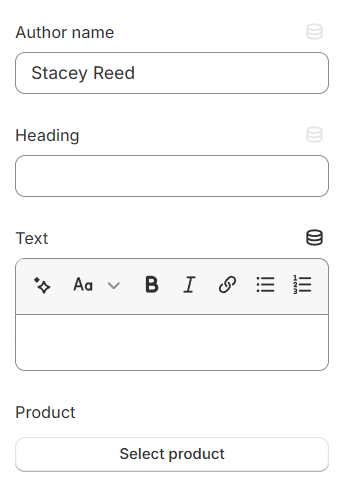 4. **`Product`** - setting allows you to select a product that will be displayed next to the text review;