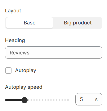 1. **`Layout`** - layout of the reviews. Can be Base, or Big product;