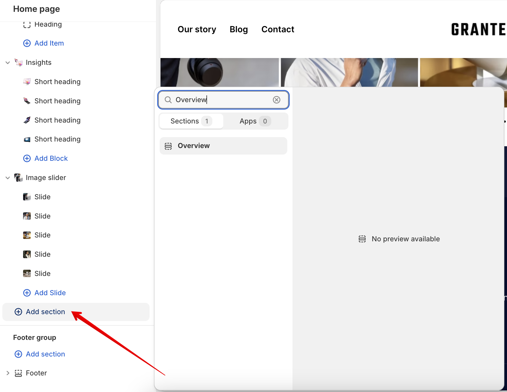 In order to add a section, you need to go to **`Customizer`** → **`Add Section`** → **`Overview`**.