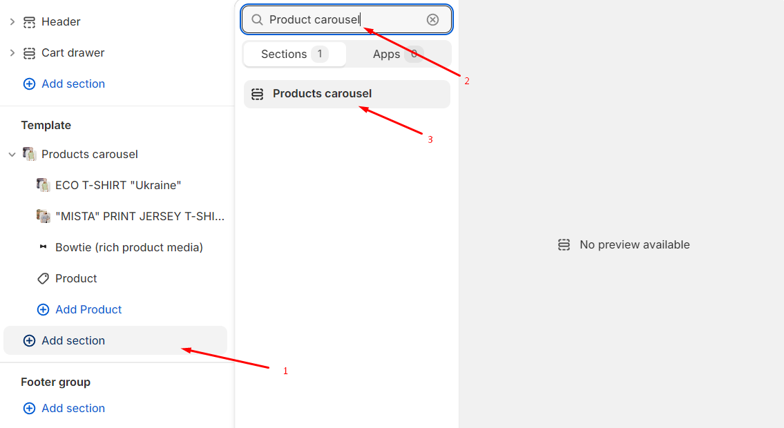 In order to add a section, you need to go to **`Customizer`** → **`Add Section`** → **`Products carousel`**.